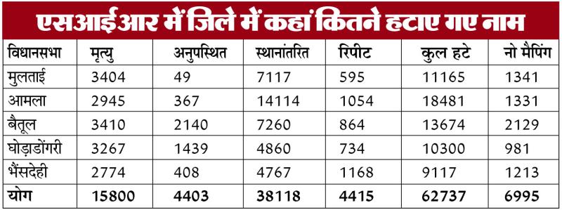 इस तरह जिले में 62737 मतदाता कम हुए हैं। इनमें सबसे ज्यादा 18481 मतदाता आमला में कम हुए हैं। वहीं सबसे कम 9117 मतदाता भैंसदेही विधानसभा क्षेत्र में कम हुए हैं। मुलताई में 11165, बैतूल में 13674 और घोड़ाडोंगरी में 10300 मतदाता कम हुए हैं।