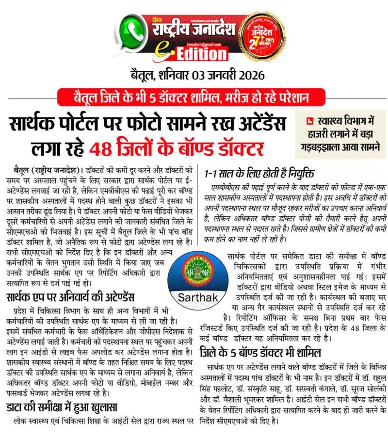 एमबीबीएस की पढ़ाई पूर्ण कर जिले के विभिन्न शासकीय अस्पतालों में बांड डॉक्टर के रूप में पदस्थ कुछ डॉक्टरों द्वारा सार्थक एप पर अटेंडेंस लगाने स्वयं कार्य स्थल पर उपस्थित न रहकर अन्य स्थानों से स्टील फोटो या वीडियो भेजकर अटेंडेंस लगाई जा रही थी। स्वास्थ्य विभाग के आईटी सेल द्वारा प्रदेश के 48 जिलों में ऐसे डॉक्टर चिन्हित किए थे जिसमें बैतूल जिले के 5 बांड डॉक्टर भी शामिल है। दैनिक राष्ट्रीय जनादेश ने 3 जनवरी के अंक में सार्थक पोर्टल पर फोटो सामने रख अटेंडेंस लगा रहे 48 जिले के बांड डॉक्टर शीर्षक से समाचार प्रकाशित किया था जिसमें जिले के पदस्थ 5 बांड डॉक्टरों द्वारा भी फोटो से अटेंडेंस लगाने का खुलासा किया था।