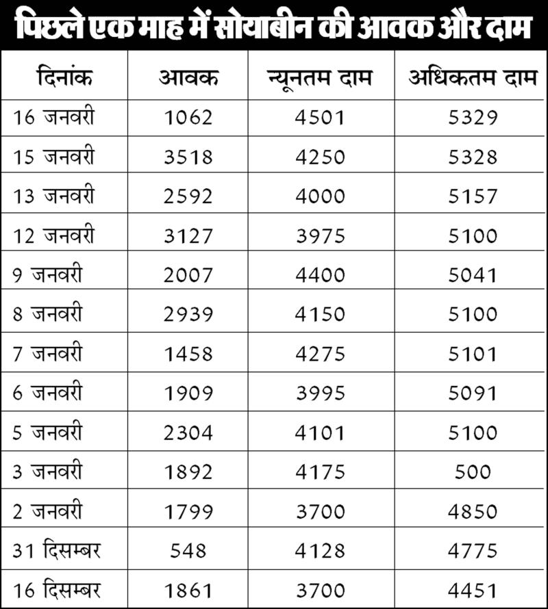 दिसम्बर माह के दूसरे पखवाड़े में ही सोयाबीन के दाम बढ़ने लगे थे। कृषि उपज मंडी बैतूल में एक माह पूर्व १६ दिसम्बर को सोयाबीन के न्यूनतम दाम ३७ सौ रूपए प्रति क्विंटल और अधिकतम दाम ४४५१ रूपए प्रति क्विंटल थे। इसके बाद दाम बढ़ने लगे साल २०२५ के अंतिम दिन ३१ दिसम्बर को सोयाबीन के न्यूनतम दाम ४१२८ रूपए और अधिकत दाम ३२४ रूपए क्विंटल बढ़कर ४७७५ रूपए हो गए थे, जो एक माह में १६ जनवरी तक ८७८ रूपए प्रति क्विंटल बढ़कर ५३२९ रूपए के इस साल के उच्चतरम स्तर पर पहुंच गए है।