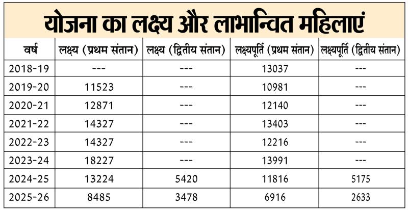 योजना के तहत जिले को मिला लक्ष्य वैसे तो कभी भी 100 प्रतिशत पूरा नहीं हुआ, लेकिन इस बार वित्त वर्ष पूरा होने के पहले ही लक्ष्य पूरा हो जाने की पूरी स्थिति बन रही है। वर्ष 2019-20 में 95.30 प्रतिशत, 2020-21 में 94.32 प्रतिशत, 2021-22 में 93.55 प्रतिशत, 2022-23 में 85.27 प्रतिशत, 2023-24 में 76.36 प्रतिशत और 2024-25 में 91.13 प्रतिशत लक्ष्य पूरा हुआ था। वहीं इस बार स्थिति यह है कि प्रथम संतान के लिए 98 प्रतिशत और द्वितीय संतान के लिए 91 प्रतिशत लक्ष्य पूर्ति हो चुकी है। जबकि अभी वित्त वर्ष समाप्ति को 2 महीने से भी ज्यादा का समय बाकी है। इस साल प्रथम संतान के लिए अभी तक 6916 और द्वितीय संतान के लिए 2633 महिलाओं ने लाभ लिया है।