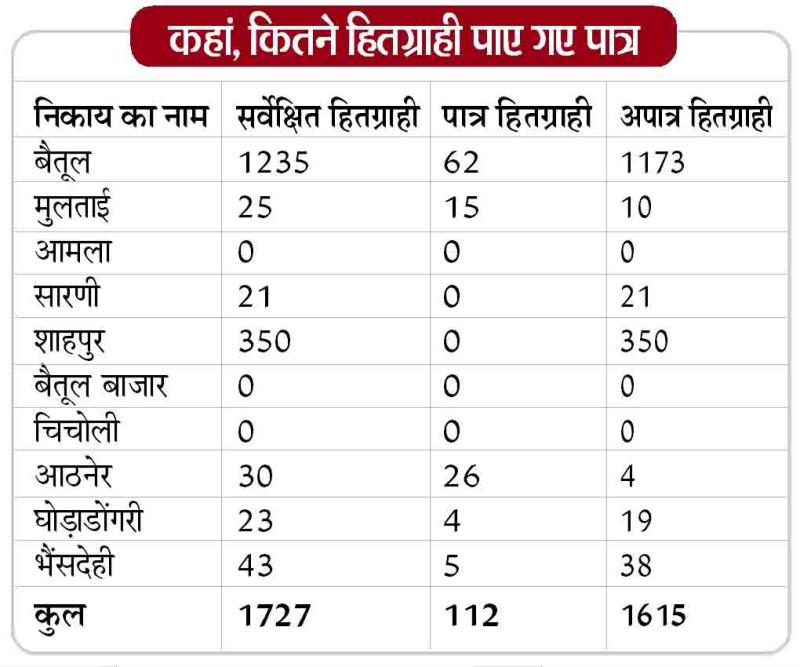 संयुक्त सर्वेक्षण में कुल 1727 परिवार ऐसे पाए गए, जिन्हें कि पट्टे की दरकार थी। इसमें सबसे ज्यादा 1235 परिवार बैतूल नगर पालिका क्षेत्र के थे। इनके अलावा शाहपुर नगर परिषद में 350, मुलताई में 25, सारणी में 21, आठनेर में 30, घोड़ाडोंगरी में 23 और भैंसदेही में 43 परिवार मिले थे। दूसरी ओर आमला, बैतूल बाजार और चिचोली में सर्वेक्षण के दौरान ऐसा एक भी परिवार नहीं मिला। बड़ी संख्या में मिले इन परिवारों को देखकर ऐसा लग रहा था कि जिले में सैकड़ों परिवारों को पट्टा वितरण हो सकेगा, लेकिन ऐसा नहीं हुआ।