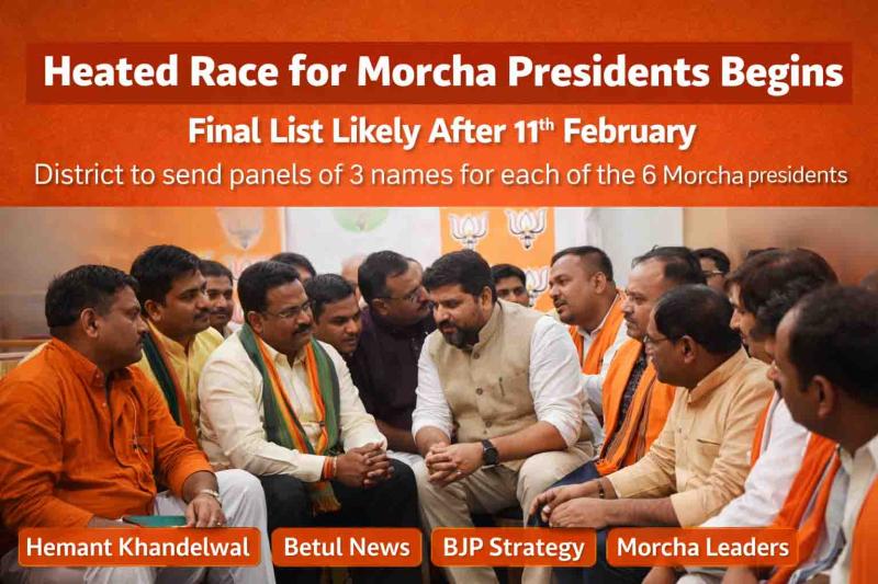 विश्वस्त सूत्रों के अनुसार 11 फरवरी को भाजपा प्रदेश अध्यक्ष हेमंत खण्डेलवाल के बैतूल में रहने की संभावना है। यदि वे बैतूल आते हैं तो उनसे सहमति लेकर प्रत्येक मोर्चा के लिए तीन-तीन नाम का पैनल तय कर भोपाल भेजा जाएगा। भाजपा प्रदेश अध्यक्ष के पद पर हेमंत खण्डेलवाल के पदस्थ होने के बाद श्री खण्डेलवाल ने सबसे कम अवधि में न सिर्फ भाजपा प्रदेश पदाधिकारियों की घोषणा कर दी बल्कि पार्टी के सात मोर्चा में से 6 मोर्चा के प्रदेश अध्यक्षों की भी घोषणा कर दी थी। मोर्चा के प्रदेश अध्यक्ष घोषित होने के बाद अब मोर्चा अध्यक्ष भी प्रदेश अध्यक्ष के नक्शे कदम पर चलते हुए सभी जिलों में मोर्चा के जिला अध्यक्षों की नियुक्ति के लिए तेज कवायद कर रहे है।