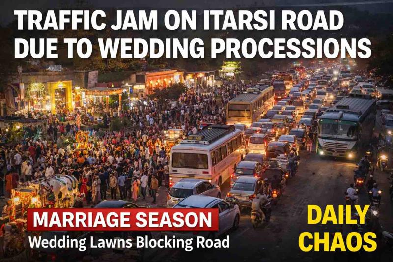 Itarsi Road Traffic Jam: बैतूल (राष्ट्रीय जनादेश)। यदि आपको किसी जरूरी काम से जल्दी में इटारसी रोड से कहीं जाना है तो आप शादी के सीजन में लगभग आधा से पौन घंटे का मार्जिन लेकर घर से निकलें... क्योंकि वैवाहिक सीजन शुरू होने के बाद शाम के समय इटारसी रोड पर ट्रैफिक की व्यवस्था बारातियों के हाथ में आ जाती है। गेंदा चौक के आगे फॉरेस्ट बेरियर तक लगभग दो किलोमीटर में वर्तमान में 6 मैरिज लॉन चल रहे हैं। इनमें प्रतिदिन किसी न किसी लॉन में और कई बार तो सभी लॉन में शादियां रहती हैं।