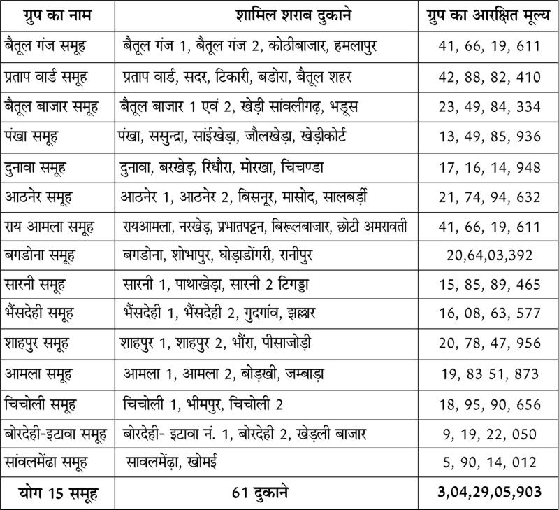 जिले के सभी 15 गु्रपों का साल 2026-27 के लिए निर्धारित आरक्षित मूल्य 304 करोड़ 29 लाख 5 हजार 903 रुपए रखा गया है। बैतूल शहर की 8 और बडोरा की एक शराब दुकान को 2 गु्रपों में रखा गया है जिसमें बैतूल गंज गु्रप में बैतूल गंज की दोनों शराब दुकानों के साथ कोठीबाजार और हमलापुर शराब दुकानों को रखा है।