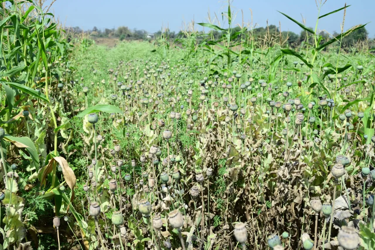 दुर्ग जिले में अवैध अफीम की खेती के मामले में पुलिस ने तीन आरोपियों को गिरफ्तार किया है। वहीं इस मामले में शामिल एक अन्य आरोपी अभी भी फरार है। पुलगांव थाना क्षेत्र के ग्राम समोदा झेंझरी के बीच अवैध खेती में भाजपा नेता विनायक ताम्रकार भी शामिल थे। 5 एकड़ 62 डिसमिल क्षेत्र में अवैध अफीम के पौधे लगाए गए थे। पुलिस ने लगभग आठ करोड़ रुपये की अनुमानित कीमत की अफीम जब्त कर ली है।जेवरा सिरसा चौकी अंतर्गत ग्राम समोदा झेंझरी के बीच स्थित एक बड़े भूभाग पर अवैध अफीम की खेती की जानकारी जब पुलिस को मिली तो एक स्पेशल टीम का गठन किया गया। इसके बाद पुलिस के अधिकारी जब मौके पर पहुंचे तो उनकी भी आंखें फटी की फटी रह गईं। पुलिस पहले अनुमान लगा रही थी कि एक एकड़ जमीन पर ही अफीम की खेती की जा रही है, लेकिन जैसे-जैसे पुलिस खेतों की तरफ आगे बढ़ी तो पता चला कि एक नहीं बल्कि 5 एकड़ 62 डिसमिल क्षेत्र में अफीम की खेती की गई थी।आरोपी भाजपा नेता विनायक ताम्रकार मक्का और ज्वार के पौधों की आड़ में अफीम की खेती कर रहा था। पुलिस ने भाजपा नेता विनायक ताम्रकार सहित विकास बिश्नोई और मनीष उर्फ गोलू ठाकुर को गिरफ्तार किया है, वहीं अचला राम जाट फरार है जिसकी तलाश पुलिस कर रही है। विकास बिश्नोई मूल रूप से राजस्थान का रहने वाला है। भाजपा नेता विनायक ताम्रकार विकास बिश्नोई के साथ मिलकर अफीम की खेती करता था।शिवनाथ नदी के तट से लगी लगभग 110 एकड़ भूमि को तार फेंसिंग से घेरा गया था। बीच में मक्का, गेहूं, धान और चना जैसी फसलें लगी हुई थीं। उन्हीं के बीच अफीम की खेती की जा रही थी। पौधों को विकसित करने के लिए ड्रिप सिंचाई की व्यवस्था भी की गई थी। ग्रामीणों ने जानकारी दी है कि आरोपी भाजपा नेता विनायक ताम्रकार ने सुरक्षा के तौर पर खेत में बाउंसर भी रखे थे, ताकि कोई बाहरी व्यक्ति अंदर न जा सके।