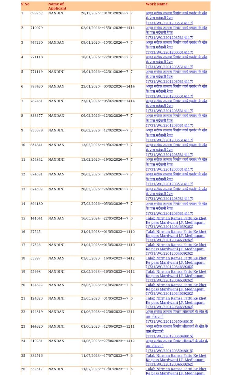 ग्रामीण क्षेत्रों में लोगों को गांव में ही काम उपलब्ध कराने चलाई जा रही मनरेगा (अब वीबी जी राम जी) योजना के तहत घोड़ाडोंगरी विकासखंड अंतर्गत ग्राम पंचायत मेंढापानी के ग्राम मर्दवानी रैयत में एकांश के खेत के पास अमृत सरोवर तालाब निर्माण कार्य चल रहा है। इसका क्रमांक 1731/डब्ल्यूसी/220/2035314117 है। मनरेगा की साइट ओपन कर जब इस कार्य में मजदूरी करने वाले मजदूरों की जानकारी निकाली गई तो इसमें आश्चर्यजनक रूप से भाजपा मंडल पाढर के अध्यक्ष नंदन यादव एवं उनकी पत्नी श्रीमती नंदनी यादव का नाम भी मजदूरों की सूची में शामिल पाया गया। दोनों ही के द्वारा 26 दिसंबर 2025 से 5 मार्च 2026 तक लगातार मजदूरी की गई है। इससे इनकी स्थिति का सहज ही अंदाजा लगाया जा सकता है।