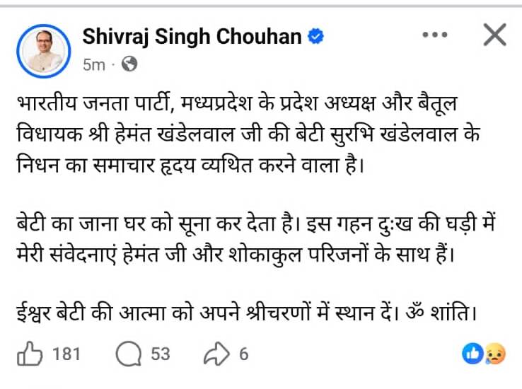 सुरभि खंडेलवाल के निधन पर पूर्व मुख्यमंत्री और केंद्रीय कृषि मंत्री शिवराज सिंह चौहान ने भी शोक जताया हैं। अपने शोक सन्देश में उन्होंने कहा कि- 'भारतीय जनता पार्टी, मध्यप्रदेश के प्रदेश अध्यक्ष और बैतूल विधायक श्री हेमंत खंडेलवाल जी की बेटी सुरभि खंडेलवाल के निधन का समाचार हृदय व्यथित करने वाला है। बेटी का जाना घर को सूना कर देता है। इस गहन दुःख की घड़ी में मेरी संवेदनाएं हेमंत जी और शोकाकुल परिजनों के साथ हैं। ईश्वर बेटी की आत्मा को अपने श्रीचरणों में स्थान दें। ॐ शांति।"