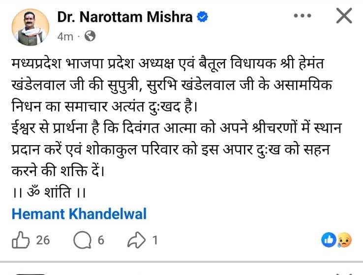 पूर्व मंत्री और वरिष्ठ भाजपा नेता डॉ नरोत्तम मिश्रा ने भी शोक जताया है। अपनी शोक सन्देश में उन्होंने कहा कि "मध्यप्रदेश भाजपा प्रदेश अध्यक्ष एवं बैतूल विधायक हेमंत खंडेलवाल जी की सुपुत्री, सुरभि खंडेलवाल जी के असामयिक निधन का समाचार अत्यंत दुःखद है। ईश्वर से प्रार्थना है कि दिवंगत आत्मा को अपने श्रीचरणों में स्थान प्रदान करें एवं शोकाकुल परिवार को इस अपार दुःख को सहन करने की शक्ति दें।"