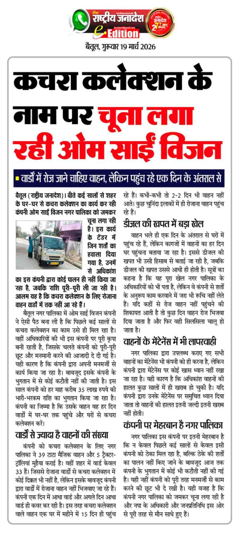 Betul Garbage Segregation: बैतूल (राष्ट्रीय जनादेश)। शहर में डोर-टू-डोर कचरा कलेक्शन का कार्य कर रही ओम साईं विजन कंपनी टेंडर की शर्तों को ताक पर रख किस कदर हर क्षेत्र में अपनी मनमानी कर रही है, यह उसकी कार्यप्रणाली से आसानी से समझा जा सकता है। एक ओर जहां कचरा लेने वाहन पूरे महीने न जाकर 15 दिन ही पहुंच रहे हैं। वहीं दूसरी ओर न तो कचरे का मौके पर ही सेग्रीगेशन किया जा रहा है और न ही आईईसी गतिविधियों पर ही कोई ध्यान कंपनी का है। आलम यह है कि स्वच्छता सर्वेक्षण में जिसकी जिम्मेदारी शहर की रैकिंग बढ़वाने की है, वही कंपनी हर महीने लाखों रुपये लेने के बाद भी हर साल रैकिंग को गिरवाने में ताकत से जुटी है।